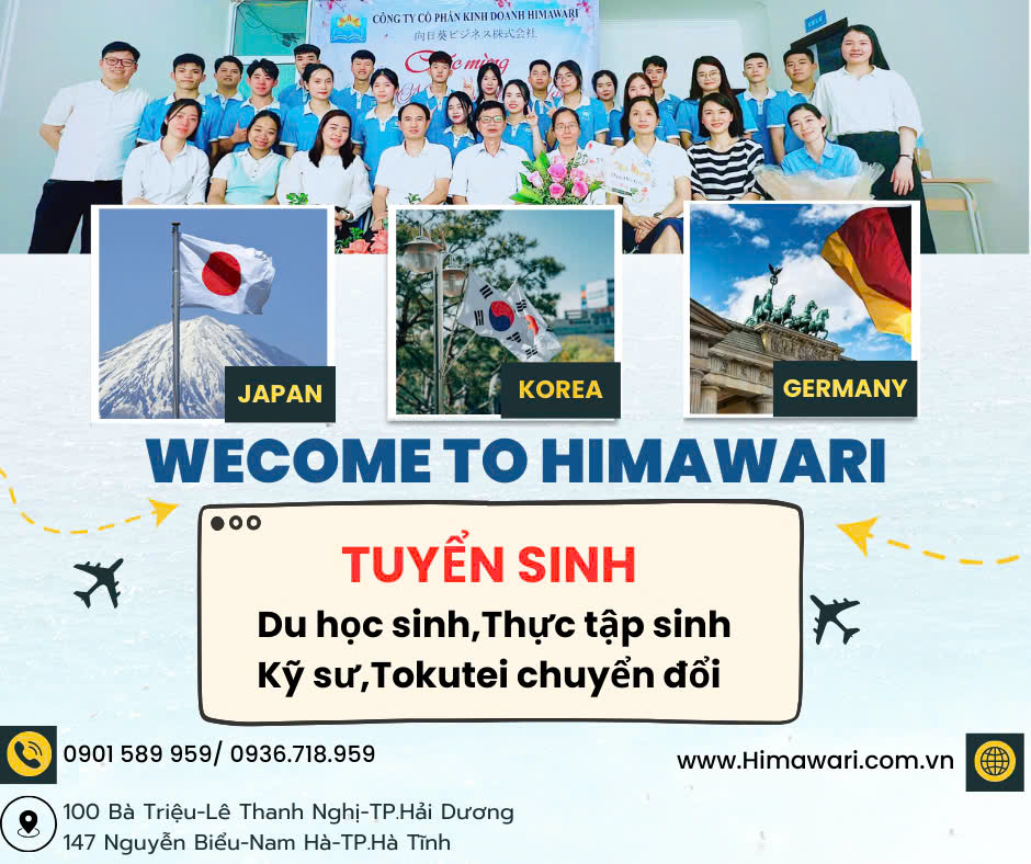 HIMAWARI hiện là đơn vị cung cấp dịch vụ tư vấn du học hàng đầu tại Việt Nam, đã có hơn 10 năm kinh nghiệm trong lĩnh vực du học qua các nước Nhật Bản, Hàn Quốc, CHLB Đức và các nước khác… Chúng tôi luôn phấn đầu, đem lại cuộc sống tốt đẹp nhất cho hàng ngàn lao động tại Việt Nam.